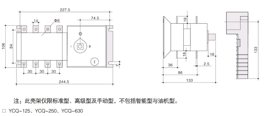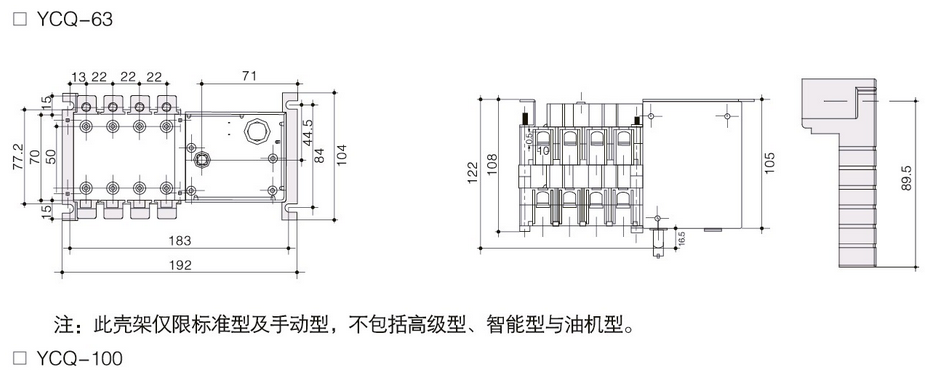 YCQ系列雙電源自動(dòng)轉(zhuǎn)換開關(guān)的最小體積為192mm×104mm×108mm,重量?jī)H2.3kg,大大節(jié)約了其所需的柜體尺寸,特別適用于現(xiàn)代化建設(shè)中的供電系統(tǒng)。